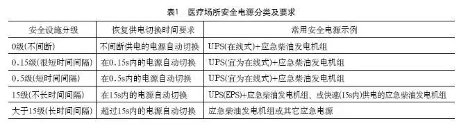 依据IEC标准和JGJ312-2013《医疗建筑电气设计规范》、GB16895.24《建筑物电气装置第7-710部分:特殊装置或场所的要求医疗场所》在医疗电气设计中,划分场所的方式有两种:一是按医疗电气设备与人体接触的状况和断电的后果,将医疗场所分为0类场所、1类场所及2类场所;另一是按医疗场所电源转换时允许间断供电的时间,分为t≤0.5s、0.5s15s三个等级。在图集19D706-2《医疗建筑电气设计与安装》第9页给出了“医疗场所及设施的类别划分与要求自动恢复供电的时间”要求,在第10页给出了各级电源对应供电恢复时间和对应配备的电源设备,如下表1: