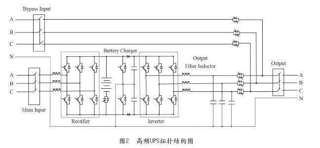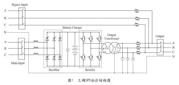 根据以上定义工频UPS和高频UPS典型的拓扑结构(不含维修旁路)示意图1、图2。