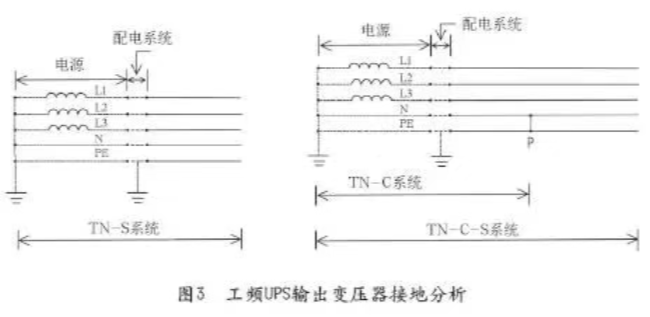 图3中左侧图形为工频UPS输出变压器二次侧的中性点未做重复接地的TN-S系统,右侧图形为工频UPS输出变压器二次侧的中性点与地线PE连接于点P后的系统。